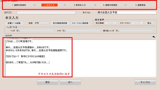 「通報内容選択」 ⇒ 「本文入力」 ⇒ 「配信先選択」 ⇒ 「内容確認」 ⇒ 「配信」の5つのステップで配信します。
